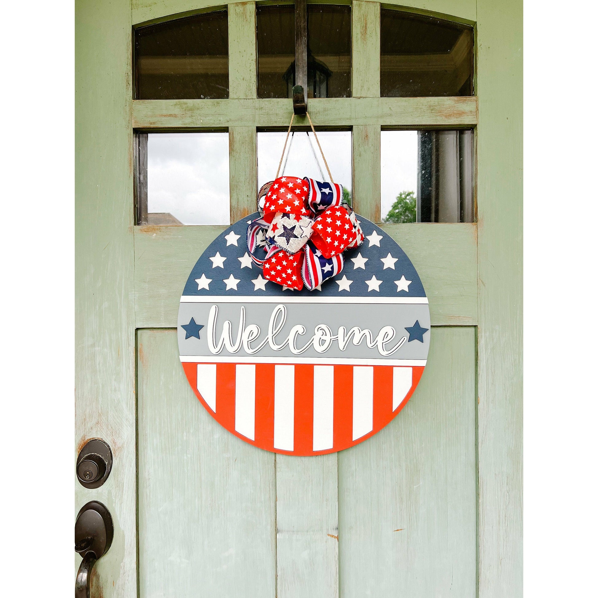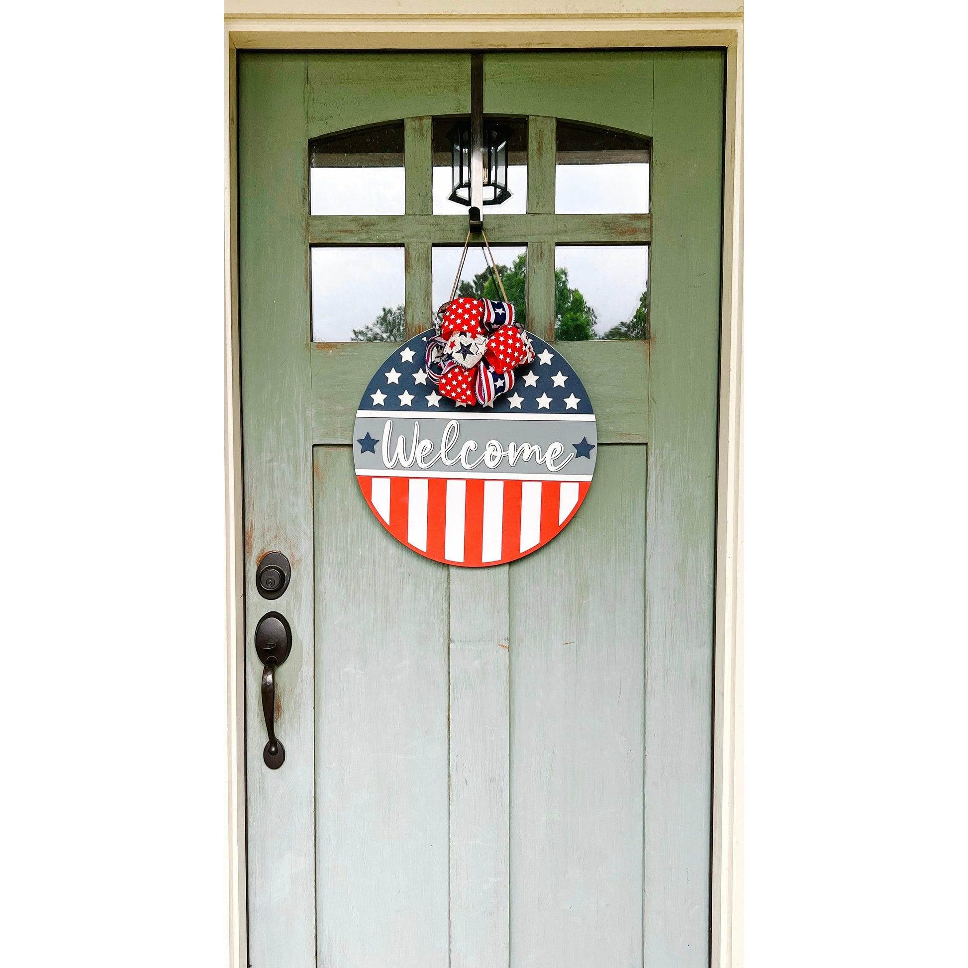 Happy 4th of July!!! Happy Independence Day!! Greet your neighbors and guests with this red, white and blue welcome door hanger.